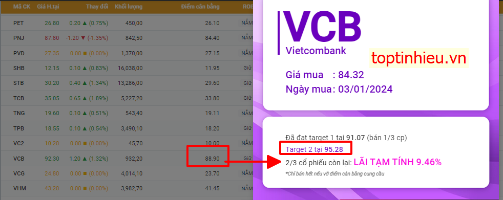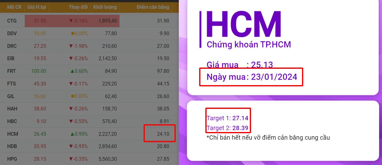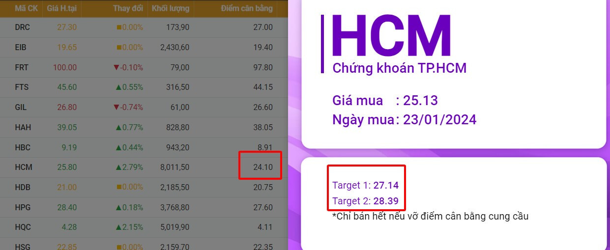 HCM điểm mua khi vượt điểm cân bằng phiên 23/1 , hôm nay cũng đã gần đạt Target đầu tiên , các thành viên theo dõi phần mềm chú ý chốt 1/3 tỉ trọng khi đạt từng target