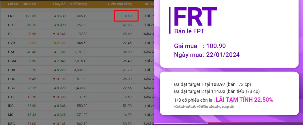 FRT hiện đã đạt đủ 2 target, nếu đang nắm giữ bạn theo dõi điểm cân bằng CUNG CẦU để tối đa hóa lợi nhuận nhé! Điểm cân bằng phiên nay là 114.6
