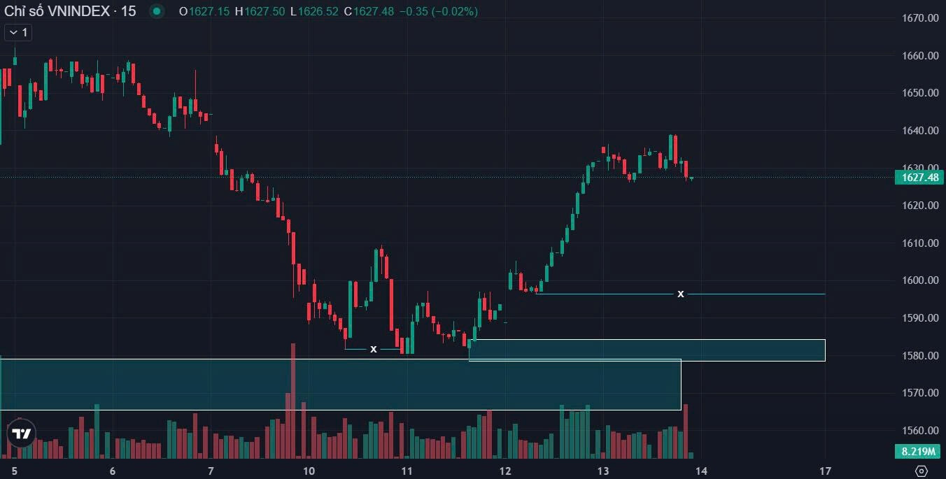 VNIndex khung m15 bắt đầu cho tín hiệu đảo chiều xu hướng giảm (chưa xác nhận), sau tín hiệu hình thành đáy ngắn hạn hôm qua thì có thể kỳ vọng cho kịch bản VNIndex test lại đáy về hỗ trợ ngắn quanh 1.578 - 1.600