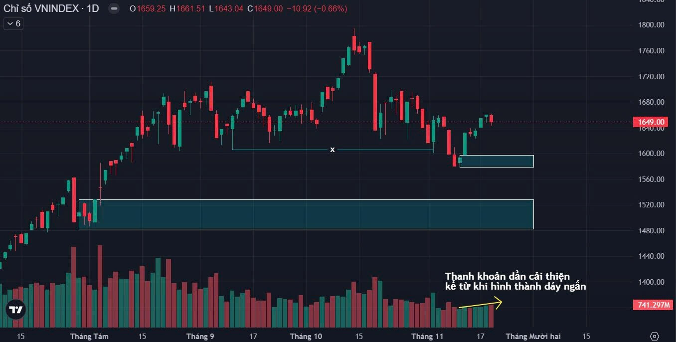 - Thanh khoản của thị trường vẫn duy trì mức thấp, nhưng đang cải thiện dần qua từng phiên kể từ khi xác nhận tạo đáy ngắn hạn phiên 12/11 → Dù chưa rõ ràng nhưng đang có tín hiệu dòng tiền tham gia dần rồi.
