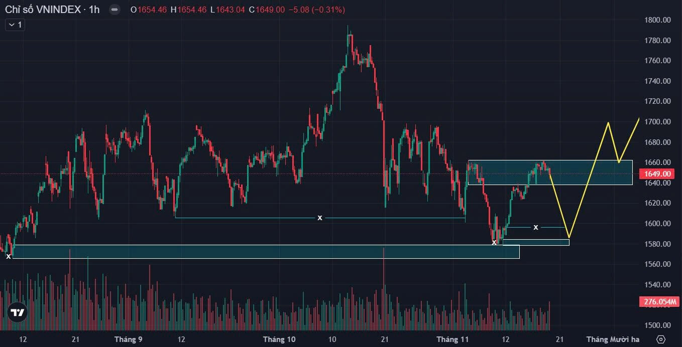 - VNIndex đã quét thanh khoản khung ngày là đủ điều kiện cần trước khi bước vào pha tăng trung hạn mới rồi, kịch bản ngắn hạn trước mắt vẫn kỳ vọng VNIndex sẽ về xuống dưới vùng <1.620 và hỗ trợ quanh 1.578 - 1.600.