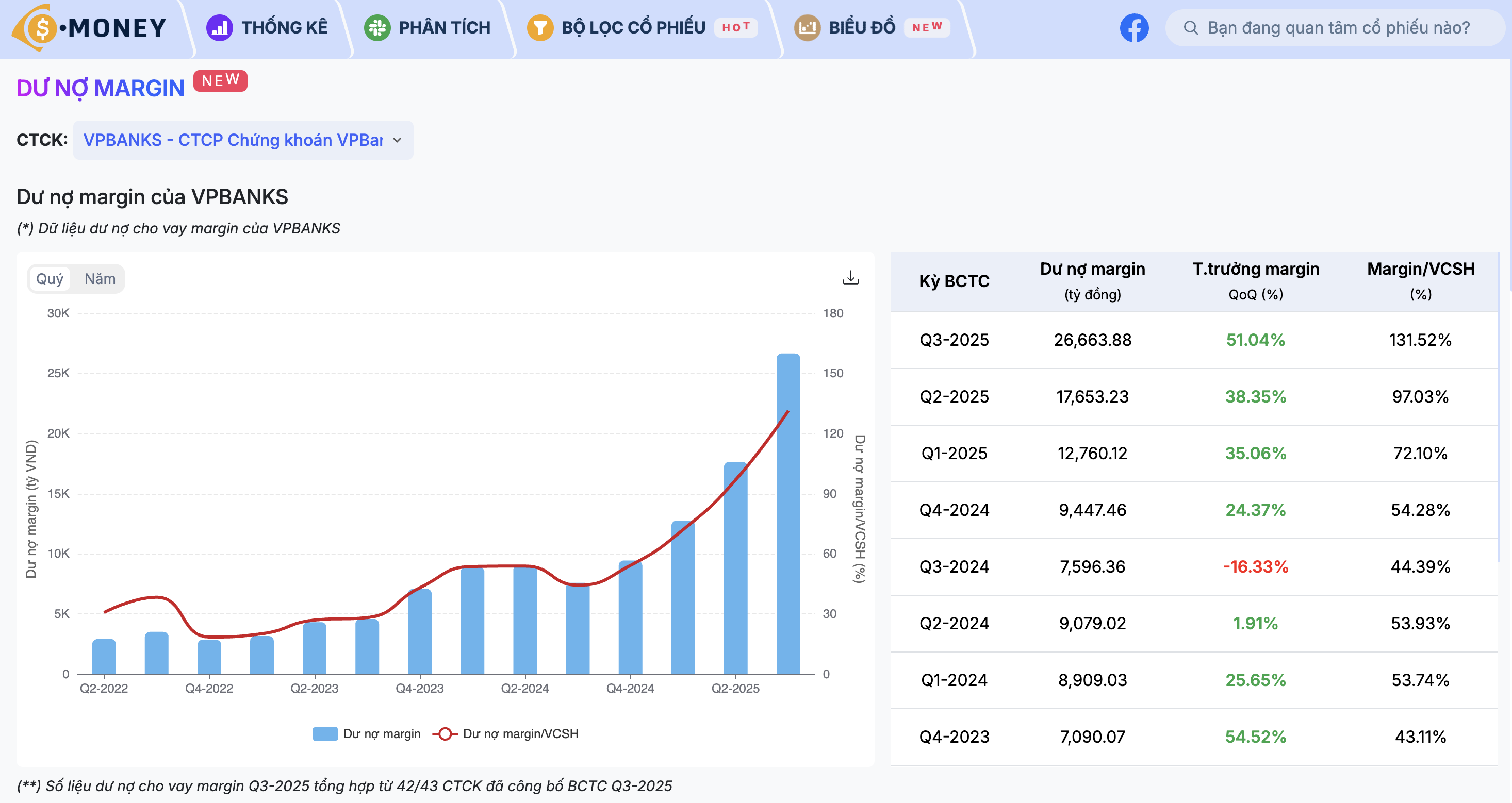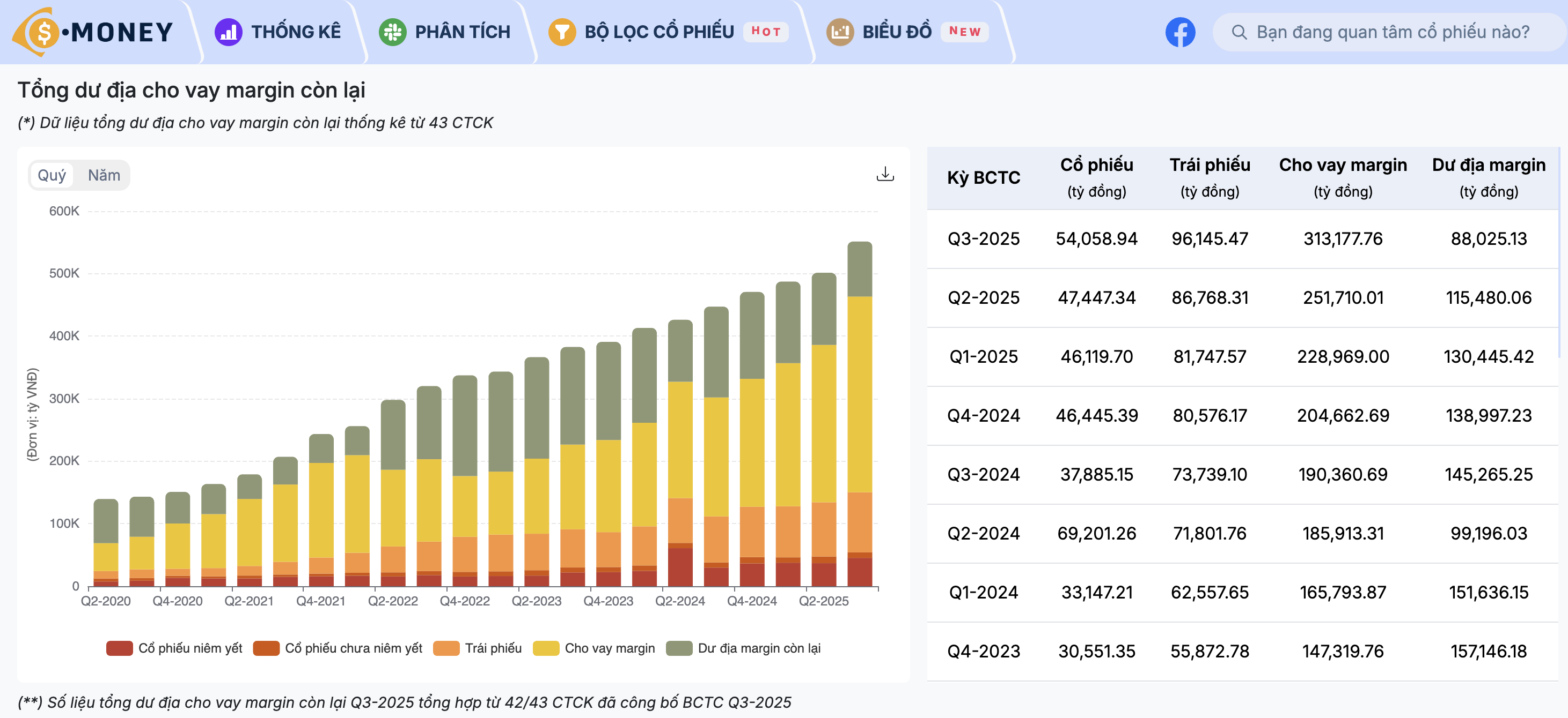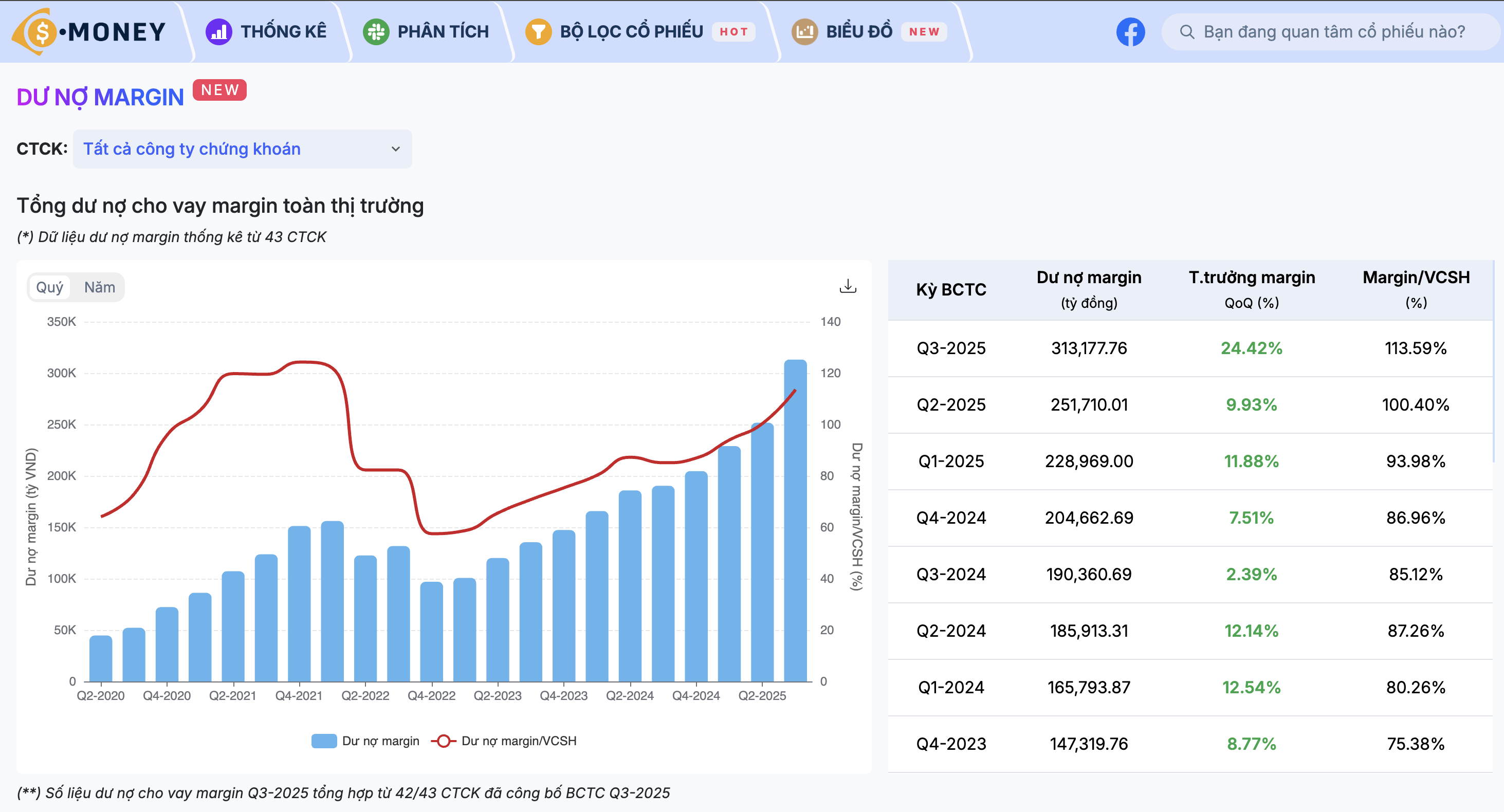 Theo dữ liệu thống kê từ Smoney (43 CTCK), Tổng dư nợ margin toàn thị trường Q3-2025 chính thức vượt mốc 300.000 tỷ đồng, tăng trưởng margin tăng mạnh 24.42%.