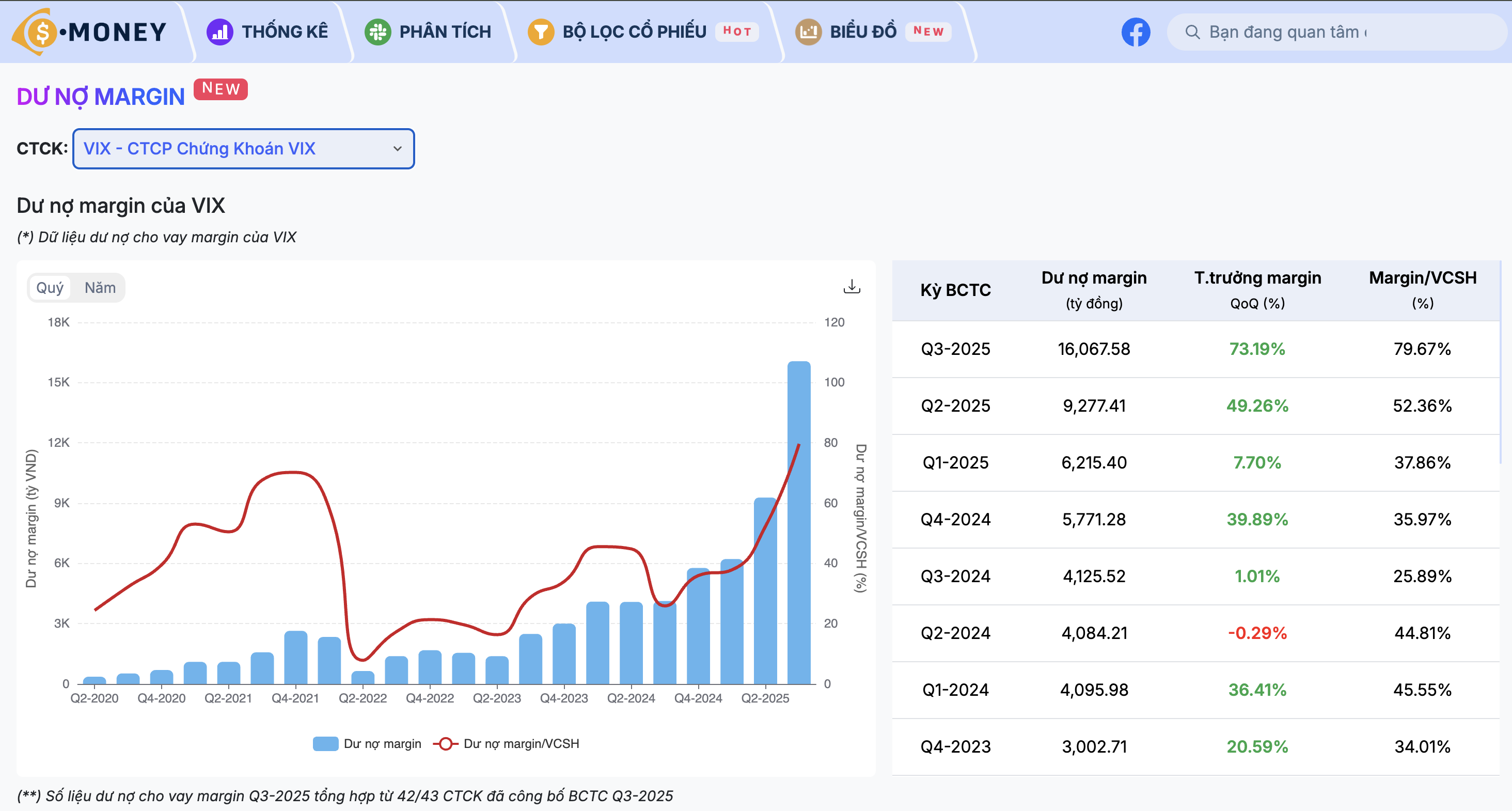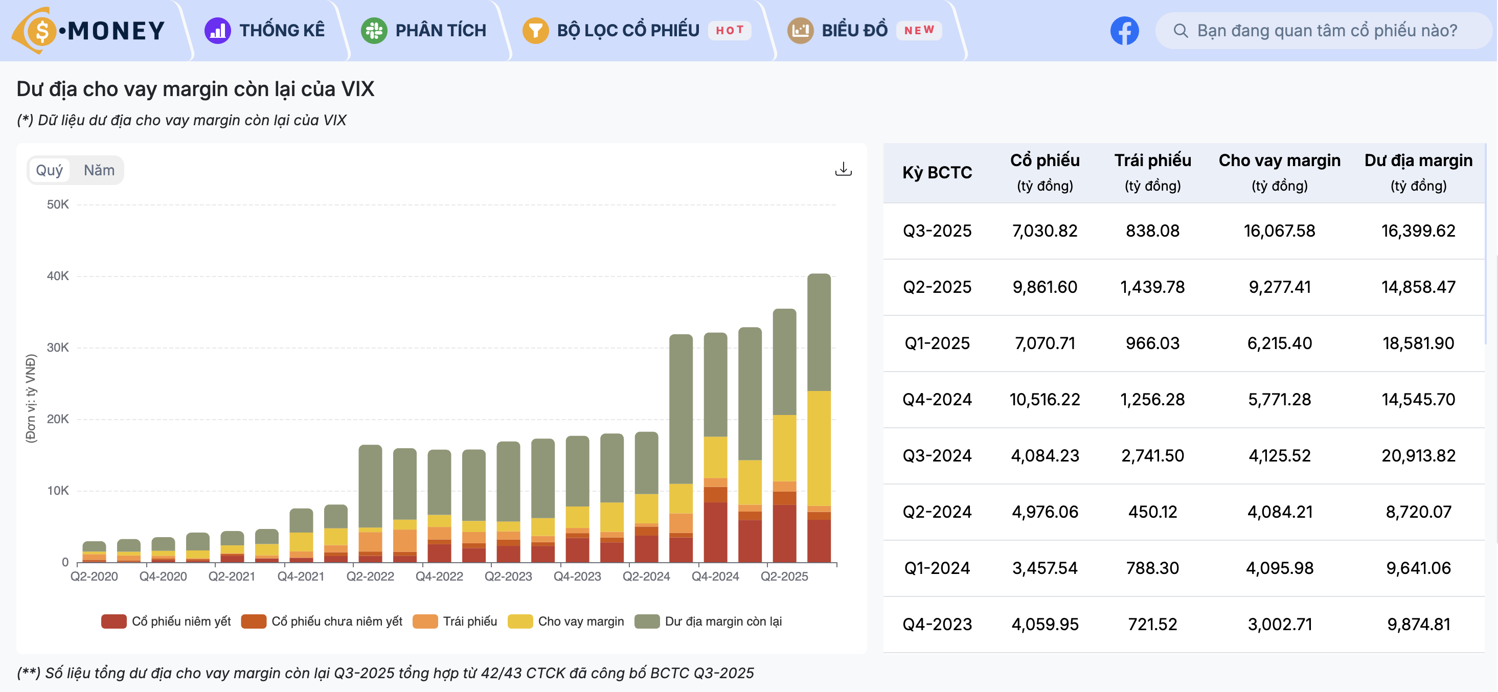 Theo thống kê từ Smoney, tính riêng Q3-2025 VIX đã bơm ra thị trường gần 7.000 tỷ đồng để cho vay margin, tăng 73% so với quý trước.