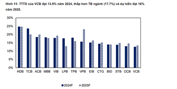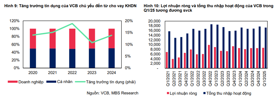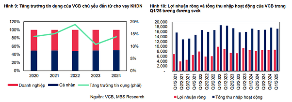 Tăng trưởng tín dụng mạnh mẽ, dự kiến đạt 16% và 15% svck trong năm 2025–2026, với động lực chính đến từ cả mảng doanh nghiệp và khách hàng cá nhân. Mảng cho vay doanh nghiệp FDI tăng trưởng 35% YTD tính đến cuối năm 2024, cho vay doanh nghiệp lớn tăng 18%, tập trung vào lĩnh vực điện, thép, ô tô; trong khi cho vay cá nhân, đặc biệt là cho vay mua nhà và hộ kinh doanh, lần lượt phục hồi tích cực.
