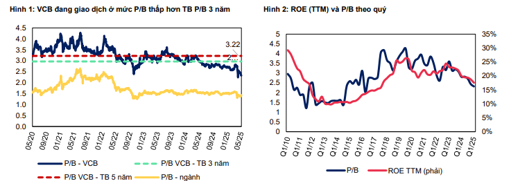 Định giá cổ phiếu hấp dẫn: cổ phiếu VCB đang giao dịch ở mức P/B 2.1x trên BVPS 2025, thấp hơn 30% so với P/B trung bình 3 năm là 3.0x. Mức giá mục tiêu được xác định là 67.300 đồng/cổ phiếu, dựa trên phương pháp thu nhập thặng dư và phương pháp P/B so sánh, điều chỉnh giảm 7% so với báo cáo trước do hạ dự báo lợi nhuận và P/B mục tiêu xuống còn 2.5x. Mức định giá hiện tại mang lại tiềm năng tăng giá 20,4%, do đó chúng tôi đưa ra khuyến nghị KHẢ QUAN đối với cổ phiếu VCB.