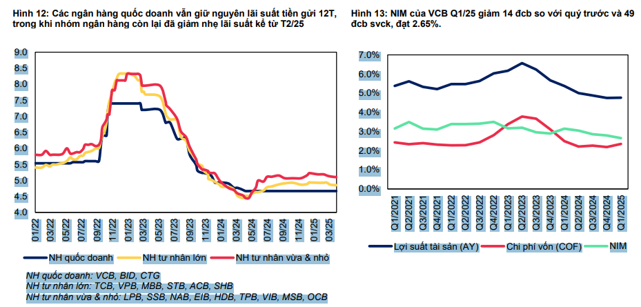 NIM của VCB trong năm 2024 đã giảm xuống còn 2,86% (-10 đcb svck) – mức thấp nhất trong 6 năm gần đây, chủ yếu do lợi suất tài sản (AY) giảm mạnh hơn so với chi phí vốn (CoF). Trong quý 1/2025, NIM tiếp tục bị co hẹp về 2,70% do tỷ trọng cho vay ngắn hạn tăng và cấu trúc huy động chuyển dịch về kỳ hạn dài với CoF cao hơn. Dự báo NIM năm 2025 sẽ tiếp tục giảm nhẹ xuống 2,70% (-15 đcb svck) do VCB vẫn phải giữ lãi suất cho vay thấp để hỗ trợ nền kinh tế theo định hướng của Chính phủ.