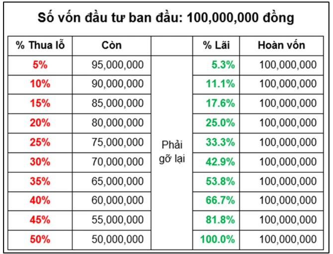 Với việc lỗ 5% thì bạn cần đầu tư lãi sau đó 5.3% thì mới hoàn vốn. Nếu số lỗ là 20% thì bạn phải lãi 25%, và khi số lỗ lên đến 50% thì bạn phải lãi 100% thì mới hoàn vốn (nhưng biết tìm đâu cho được một cổ phiếu tăng giá gấp đôi trên thị trường chứng khoán Việt Nam???)