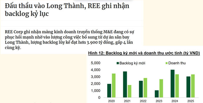 Backlog mảng cơ điện của Cổ phiếu REE cũng tăng trưởng gấp 4 lần trong năm 2024, đạt 3.902 tỷ đồng, chủ yếu nhờ dự án Sân bay Quốc tế Long Thành. Doanh thu và lợi nhuận từ dự án này dự kiến sẽ được hạch toán vào giai đoạn 2025-2026.