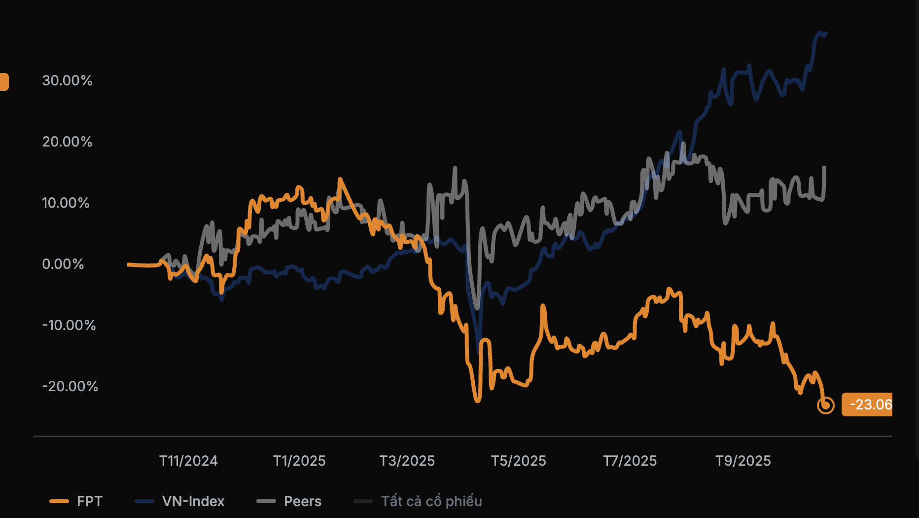 FPT là ví dụ điển hình — doanh nghiệp đầu ngành, lợi nhuận tăng đều, nhưng giá cổ phiếu vẫn đi ngược thị trường.