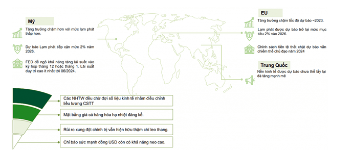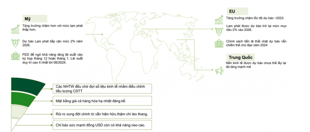 Trên bình diện thế giới, các yếu tố như: Chính sách tiền tệ khác nhau giữa các nước; Cạnh tranh nước lớn gia tăng; Rủi ro địa chính trị chưa dịu bớt… Các dự báo: (1) Nền kinh tế Hoa Kỳ khả năng hạ cánh mềm; (2) Ẩn số Trung Quốc với chính sách tập trung vào tăng trưởng; (3) EU duy trì chính sách tiền tệ thắt chặt năm 2024. Do đó con đường phục hồi của các nền kinh tế lớn năm 2024 rất đa dạng và chính vì vậy đây được gọi là giai đoạn “Thế Giới Phân Mảnh”.