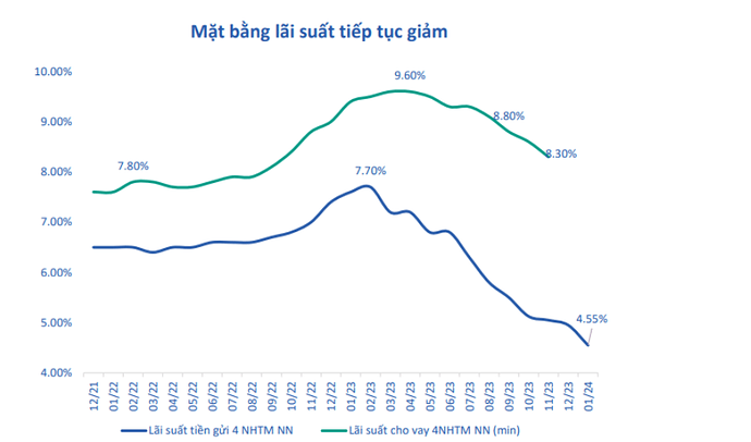 Đầu năm 2024, “tiền gửi“ tại ngân hàng vẫn tiếp tục tăng cao. Điều này cho thấy lượng tiền của NĐT cá nhân ở ngoài rất dồi dào và đang thận trọng đợi chờ những cơ hội rõ ràng từ thị trường. Trong năm 2023 nhà đầu tư cá nhân chiếm tới 92,2% khối lượng giao dịch trung bình ngày, do đó khi thông tin kinh tế khởi sắc thì dòng vốn này sẽ là động lực thúc đẩy thị trường chứng khoán có bước nhảy vọt.s