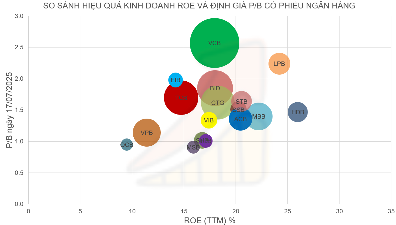 Tức là nếu mua các cổ phiếu ngân hàng niêm yết đó ở mức giá thị trường hiện tại (ngày lấy số liệu 17/07/2025) thì nhà đầu tư gần như đang góp vốn vào kinh doanh ngân hàng mà không phải bỏ công sức ra xây dựng, vận hành cái banking business đó! Và với mức hiệu hiệu quả kinh doanh cũng tương đối ổn Lợi nhuận/Vốn chủ (ROE) khoảng 15-17%/năm (MSB, SHB, TPB…) như vậy là NĐT đang quá hời!?