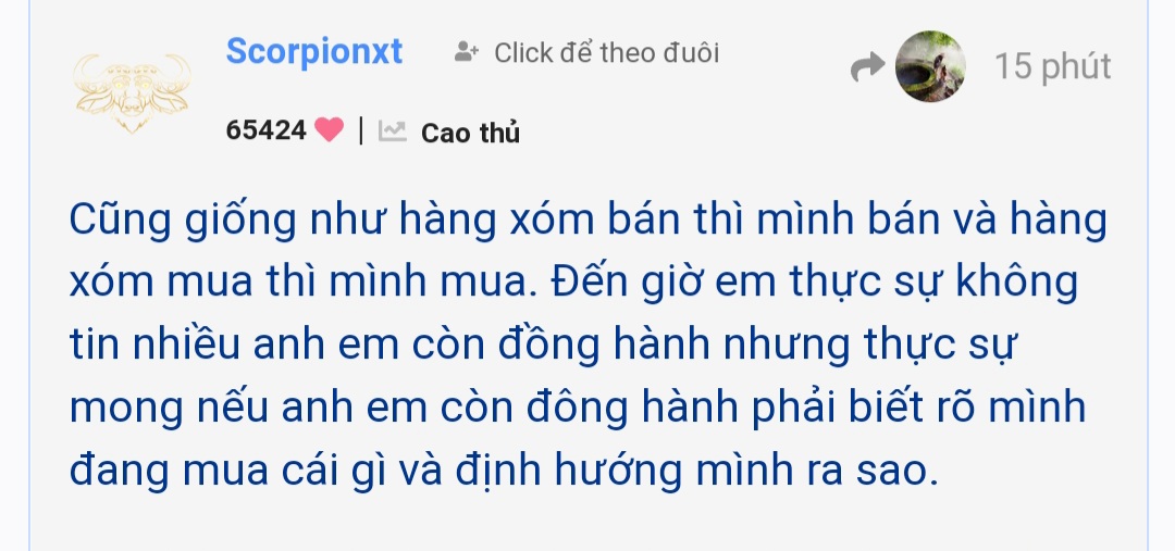 Cũng giống như hàng xóm bán thì mình bán và hàng xóm mua thì mình mua. Đến giờ em thực sự không tin nhiều anh em còn đồng hành nhưng thực sự mong nếu anh em còn đông hành phải biết rõ mình đang mua cái gì và định hướng mình ra sao.