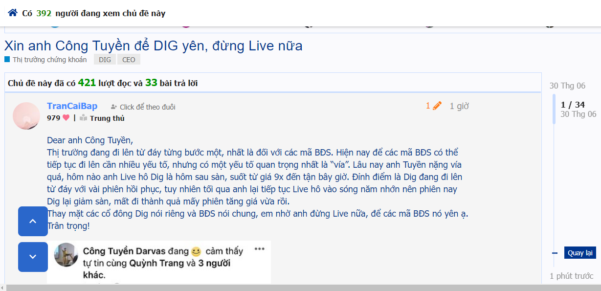 Haha mai tôi lại đi câu sàn DIG và CEO cho các bác nhé. Nay tôi múc DIG giá 37.2 từ sáng đảo HPG sang. Mai còn tiền múc sàn tiếp cho nó có tý phong thuỷ đi chơi về thấy sát sàn.