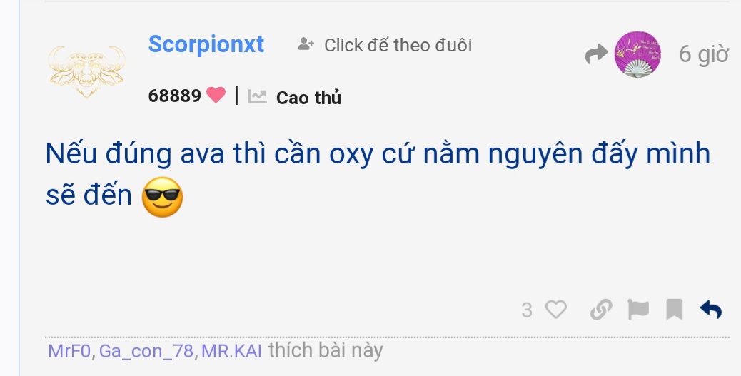 Bác @ProCk ơi, các bạn @Rosalie, @Linka456 , @Ga_con_78 ơi, đòi lại công bằng giúp mình đi! Hôm đầu tháng mình đã tặng bạn Bọ Cạp cả bó hoa tím to đùng, thế mà Dig mình “đủng đỉnh như voi ăn no” ở giá 88 ( số đẹp, khớp với năm sinh của mình