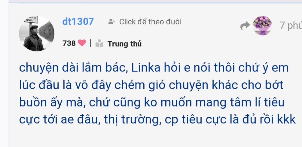 chuyện dài lắm bác, Linka hỏi e nói thôi chứ ý em lúc đầu là vô đây chém gió chuyện khác cho bớt buồn ấy mà, chứ cũng ko muốn mang tâm lí tiêu cực tới ae đâu, thị trường, cp tiêu cực là đủ rồi kkk