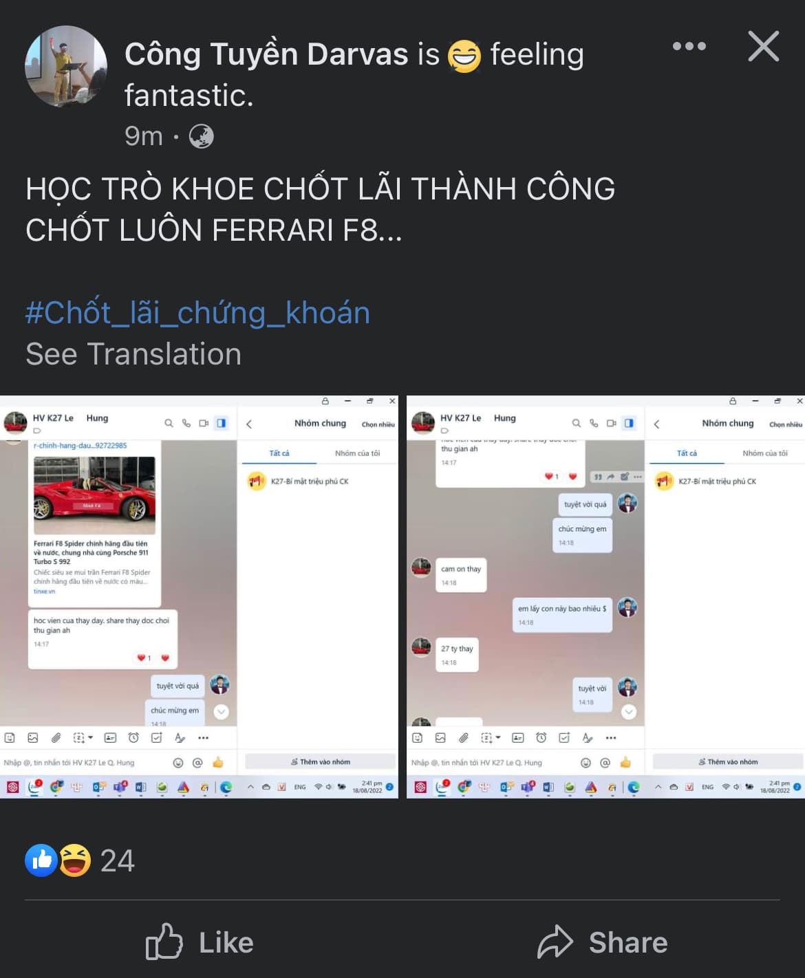 Thằng Học trò kia bố mẹ nó cho tiền. Chứ ko phải chốt lãi rồi mua Fe. Vậy mà a Tuyền lại lái sang chơi chứng theo a Tuyền chốt lãi và mua Fe. a Tuyền hay quá