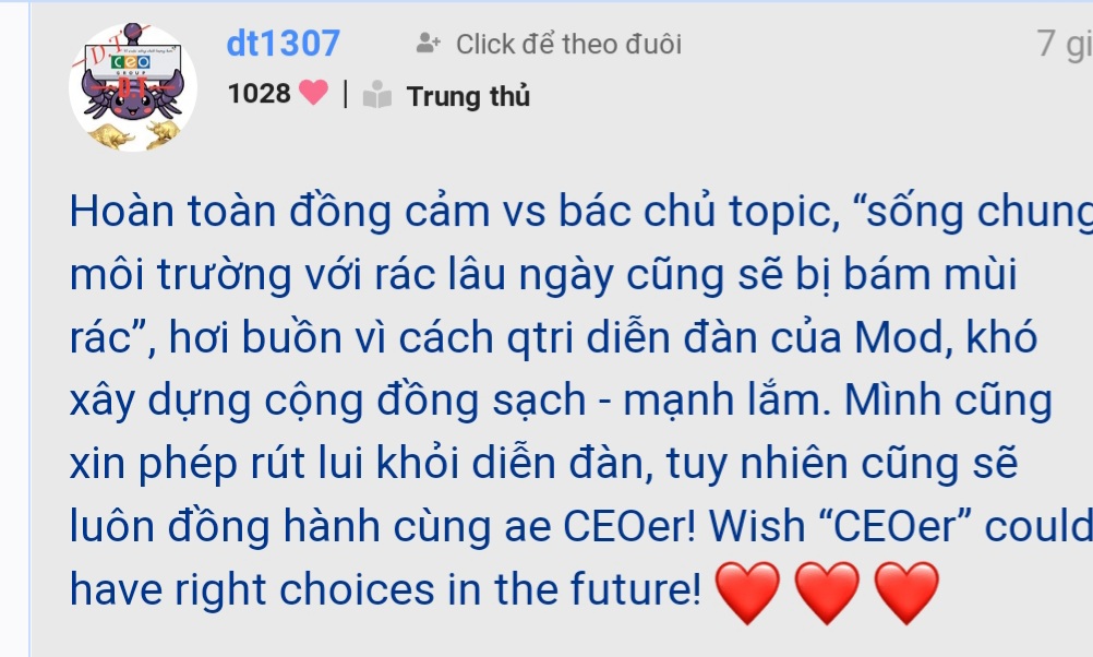 Nhưng những Ceoers thì lúc nào cũng “lovely” mà anh! Chúng ta ở đây vì những đồng đội mình yêu mến, đâu phải vì mod cũng đâu phải vì F247 đâu anh! Sống vì những người mình yêu và yêu mình anh ah! Nếu có thời gian rảnh, anh cứ lên chia sẻ với mọi người như trước đây anh nha!