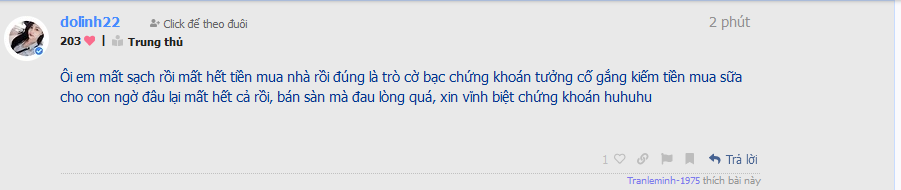 Em mất sạch rồi chẳng còn gì nữa để mà quan tâm ở cái thị trường này nó nát bét rồi, chính thức bán sạch sàn nghỉ ngơi và không bao giờ quay lại chứng khoán