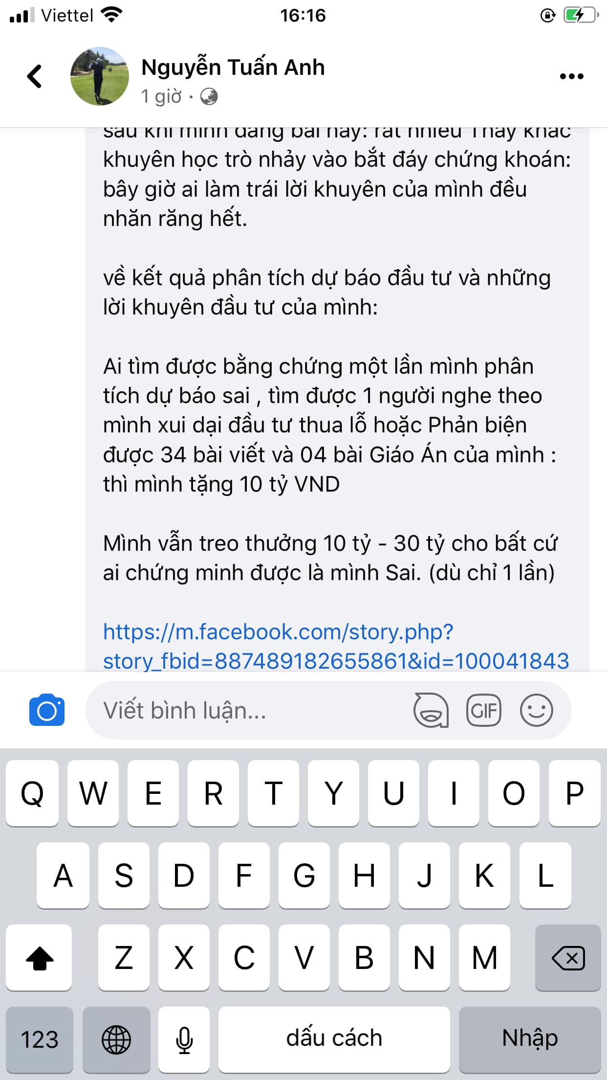 Thực ra, pic này ai cũng tôn trọng ý kiến của người khác hết bạn ạ. Có điều, tham gia từ đầu pic tới giờ tôi chưa thấy ai phản biện mà thuyết phục, bằng chứng, số liệu rõ ràng, họ đơn giản chỉ là cay cú rồi chê bai, chửi rủa…làm vậy để làm gì? những người khác ai cũng âm tk rồi nên không đáng để bị ảnh hưởng tiêu cực từ các bạn nữa nên các bạn bị warning - vậy thôi. Mà quan trọng hơn cả, chúng tôi cũng đang muốn chia sẻ, động viên với chính bạn, bọn tôi ai cũng âm 6,70% mà vẫn ở đây thì bạn nghĩ bọn tôi là loại người gì? Bạn chê, bạn cứ chứng minh! Tôi nhớ trước bạn còn khen, vậy giờ bạn chê là vì điều gì? DN lừa gạt bạn à? bạn mua CEO vì cái gì? nếu mua CEO vì Vni thì khi Vni bắt đầu giảm bạn phải bán đi, bạn còn ở lại là còn tin vào DN, nhưng DN vẫn tốt thì bạn lại vin vào Vni để chửi? Và bọn tôi thấy CEO ngon thì nói ngon, chả bao giờ bọn tôi thấy ngon thì nói bạn phải thấy ngon. Với mấy người cmt như bạn, tôi ko thích nói nhiều nhưng tôi đoán, bạn ko phải cl nhưng bạn đang bế tắc nên thôi tôi cũng muốn chia sẻ chút, cũng là để động viên bạn bình tĩnh, sáng suốt và cẩn trọng hơn trong ngôn từ của mình. Vốn dĩ pic này lập ra là để chúng ta cùng chia sẻ, động viên nhau vượt qua những giai đoạn thế này! Còn ai ko tin thì cứ lẳng lặng đi ra thôi.