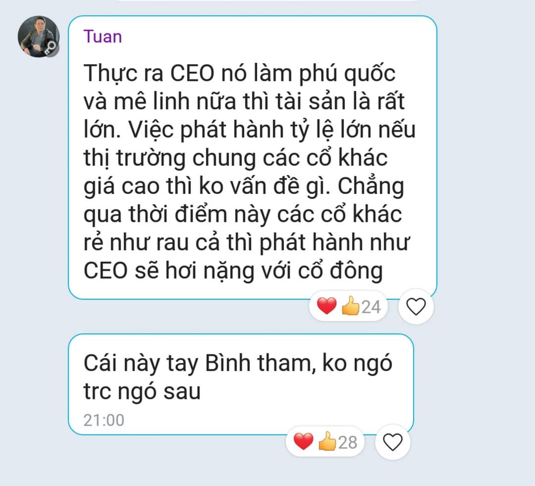 Tôi coi đây là hành động lùa gà có chủ đích. Trong khi VNI tăng liên tục từ 8/6 thì CEO giảm từ 28 về 19.8 tức bay 30% vốn hóa. Trong khi nhiều cp bđs đang tăng rất mạnh và vào xu hướng tăng tốt còn CEO lại cắm mỏ. Vậy mọi người nghe theo Huyền để bán nhà hay mua nhà???