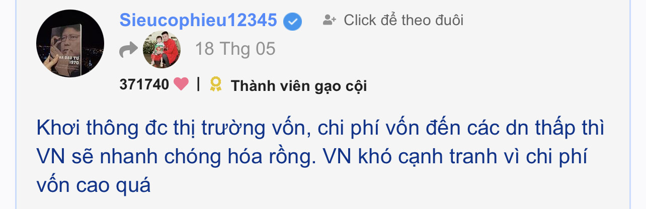Từ 2009 Bác Chính đã viết sách này, ttck được dành riêng 1 chương. Tôi tin sau 2 nhiệm kỳ của Bác, ttck sẽ là kênh dẫn vốn trung và dài hạn cho doanh nghiệp trong nền kinh tế thay vì phải thông qua ngân hàng như hiện tại. Vĩ mô VN quá tốt dưới sự lãnh đạo của CP đương nhiệm.