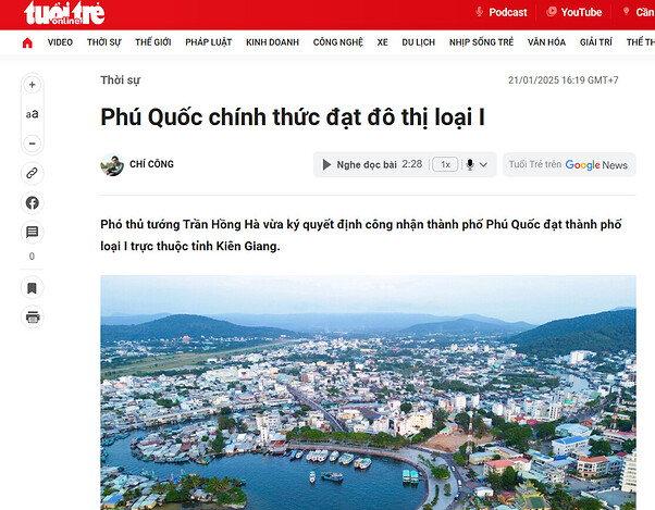 - Chiều ngày 14/03/2025, Thủ tướng Chính phủ đã công bố quyết định số 199/QĐ-TTg ngày 21/1/2025 công nhận Thành phố Phú Quốc là đô thị loại 1, trực thuộc tỉnh Kiên Giang; có sự tham gia của phó thủ tướng Chính phủ Trần Hồng Hà và nguyên thủ tướng Nguyễn Tấn Dũng. Cũng sau đó, ngày 15/03/2025, thủ tướng Chính phủ đã công bố quyết định số 195/QĐ-TTg công nhận Thành phố Rạch Giá Kiên Giang là đô thị loại 1, trực thuộc tỉnh Kiên Giang.