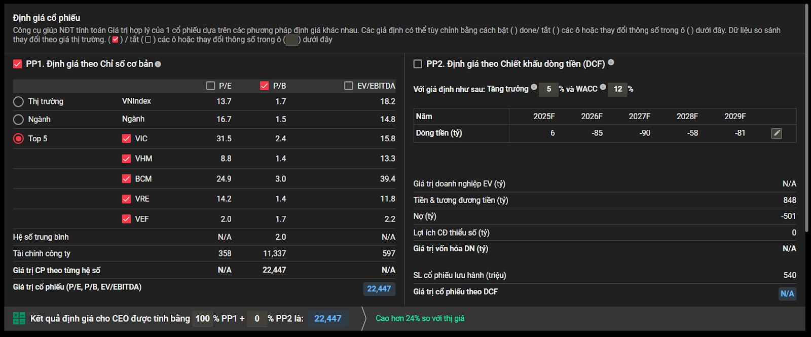- Vì CEO đang sở hữu quỹ đất chiến lược rất lớn nên tôi sẽ sử dụng P/B để định giá so với top 5 doanh nghiệp bất động sản cũng có quỹ đất đẹp. Mức giá hợp lý cho CEO hiện tại ở mức 22400 đồng/cổ phiếu, tương ứng với mức upsize 24%.