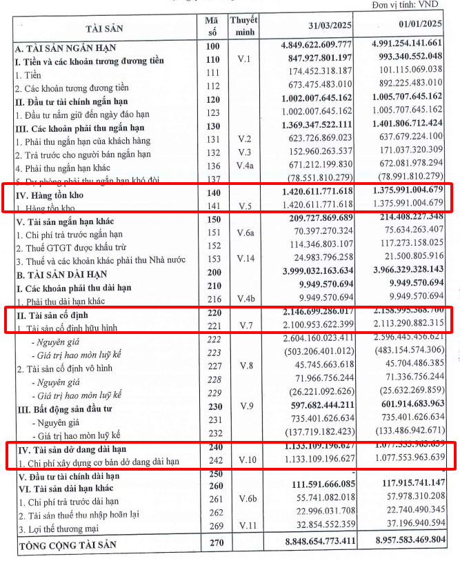 - Tại thời điểm cuối quý 1/2025, CEO đang có hơn 1800 tỷ tiền mặt và tương đương tiền trong đó chỉ ghi nhận khoảng 700 tỷ đồng nợ vay và nợ phải trả. Phần lớn tài sản của CEO chủ yếu nằm ở hàng tồn kho, xây dựng dở dang, tài sản dài hạn là quỹ đất chờ để phát triển dự án.