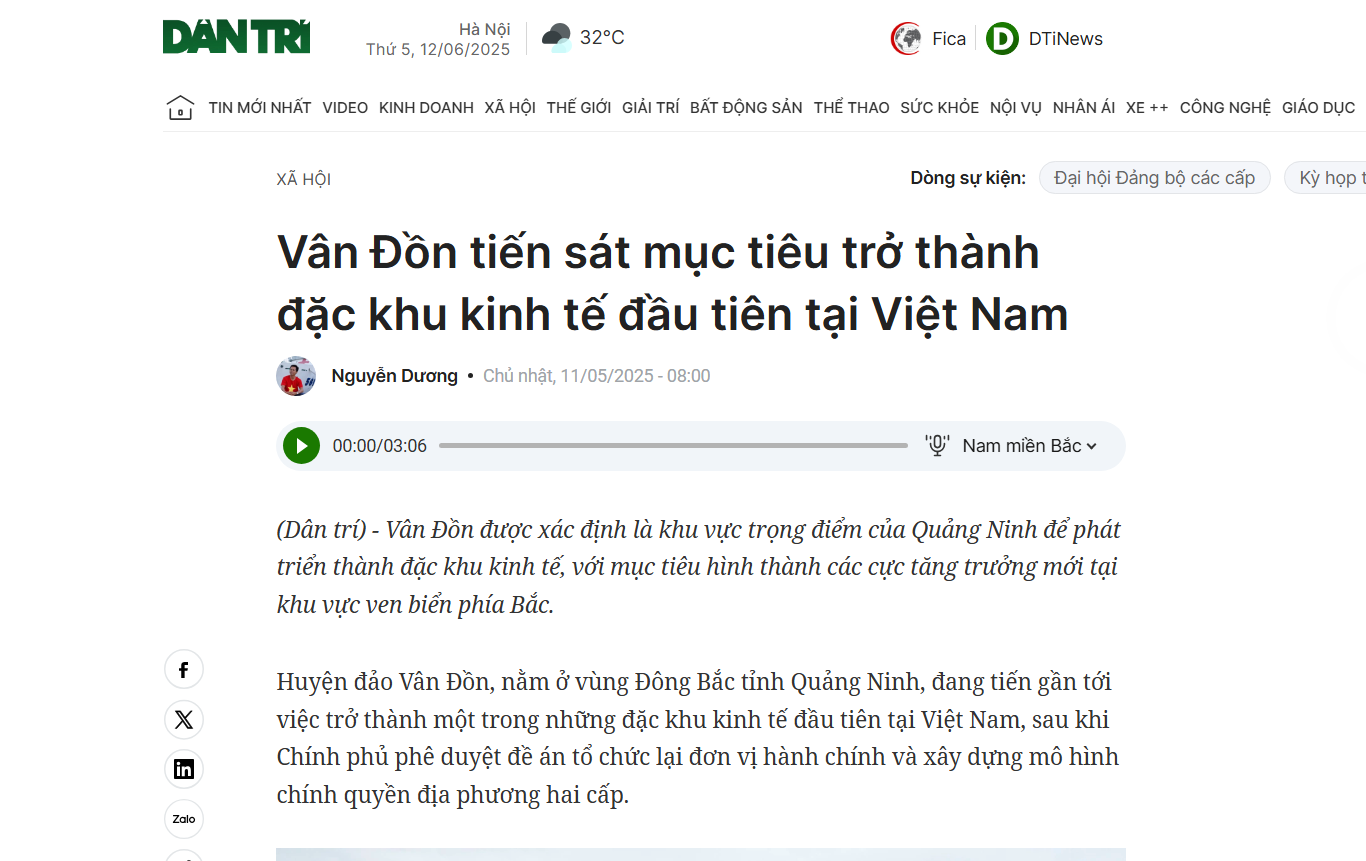 - Bộ Chính trị chỉ đạo Quảng Ninh xây dựng đề án chính sách thí điểm cho Khu kinh tế Vân Đồn theo mô hình đặc khu.