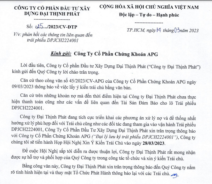 Mới đây, Công ty Cổ phần Đầu tư Xây Dựng Đại Thịnh Phát (Công ty Đại Thịnh Phát) đã có văn bản gửi đến Công ty Cổ Phần Chứng Khoán APG để phản hồi thông tin liên quan đến hai lô trái phiếu DPJCH2224001 và DPJCH2224002 trị giá gần 1.000 tỷ đồng.