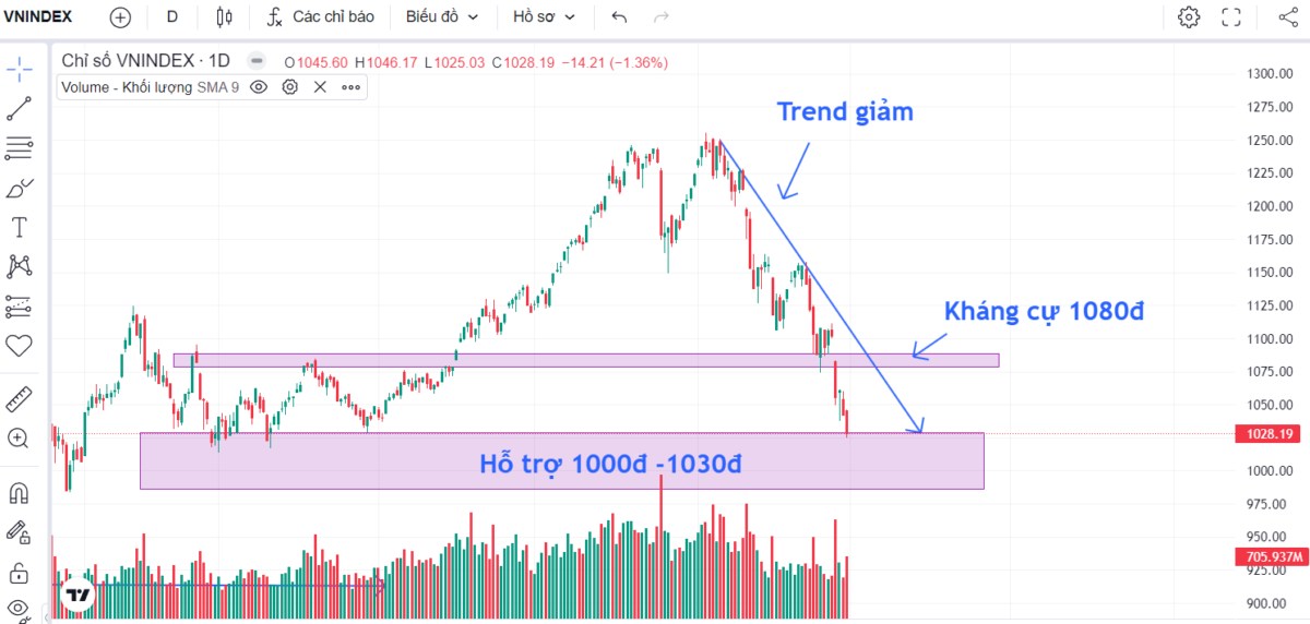 Cho thấy sự khốc liệt của chứng khoán Việt Nam. Hiện tại thị trường chứng khoán Việt Nam đang tiến vào vùng hỗ trợ là 1000đ - 1030đ. Hôm nay đã đóng cửa giảm 14đ tại số điểm là 1028đ và thanh khoản có sự gia tăng lên ở mức 14000 tỷ. Đây là một tín hiệu cho thấy đã có cầu giá rẻ.