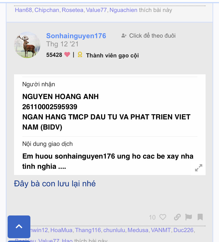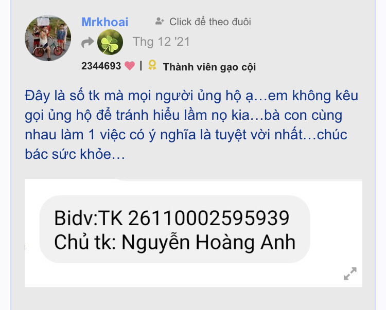 Tôi thấy bác đang bênh bác Khoai, còn bác Khoai nhận tiền từ thiện của bà con thì cũng phải công bố thu chi rõ ràng ( nếu tiền của bác ấy bỏ ra thì chẳng ai hỏi làm gì) đã dính đến tiền của cộng đồng mọi thứ phải rõ ràng điều này đứa trẻ nó cũng hiểu