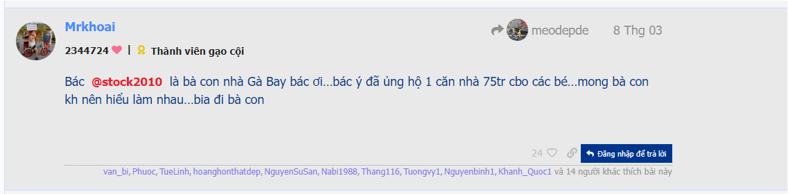Hi. Chào bà con và các bác trong pic. Em dạo này ít lên F cũng do công việc và thời gian không cho phép,em có ý kiến thế này về việc quyên góp em xác nhận bác Khoai không có hô hào mà do một số bà con có tấm lòng muốn ủng các bé vùng cao đỡ khó khăn. Và việc ủng hộ cũng chỉ là một ly,một lai thôi chứ không có như nhiều bác không rõ vào F nói thiếu cơ sở là không hay. Vậy các bác trong pic nên có cái nhìn khách quan,không nên nói điều mà mình chưa rõ,thanks bà con