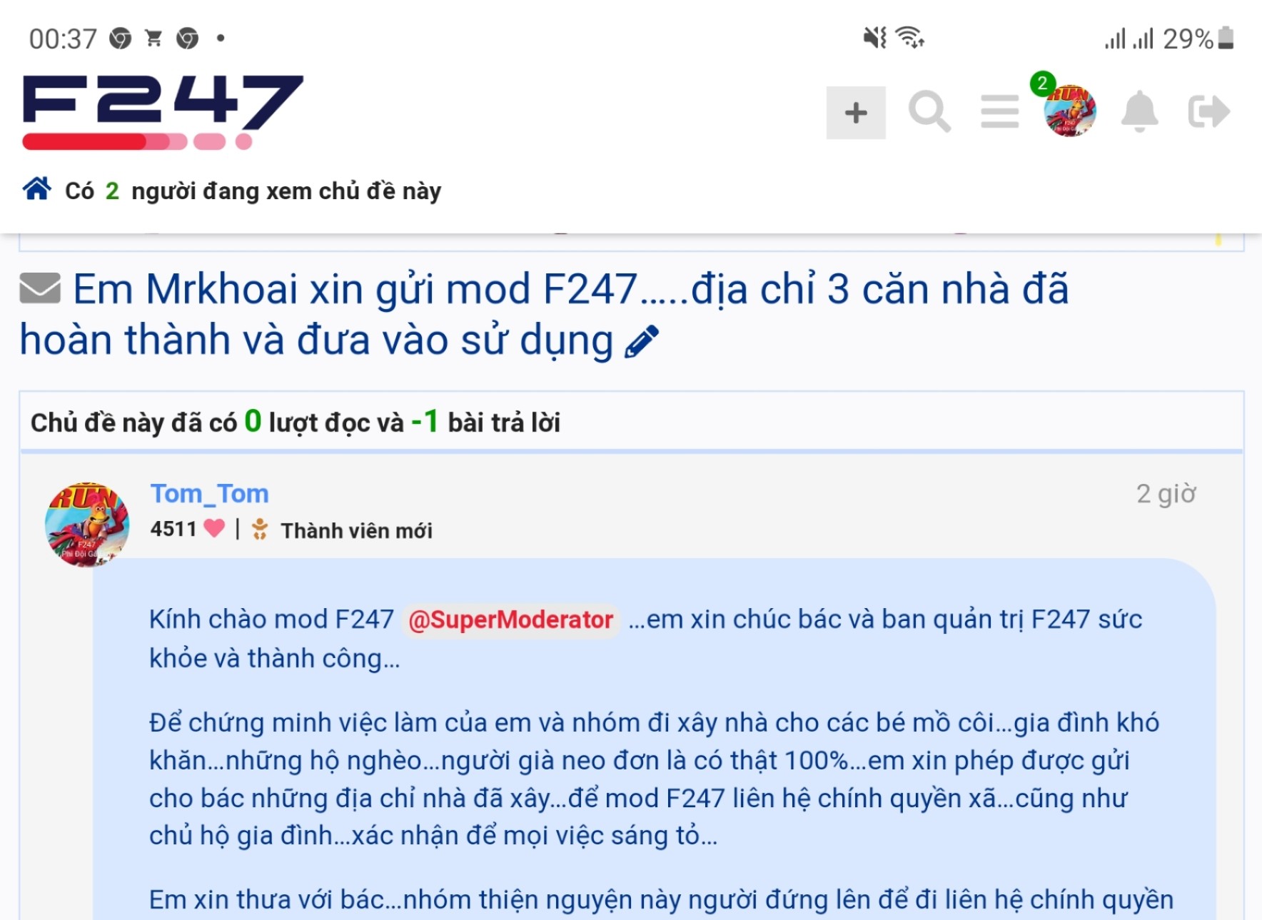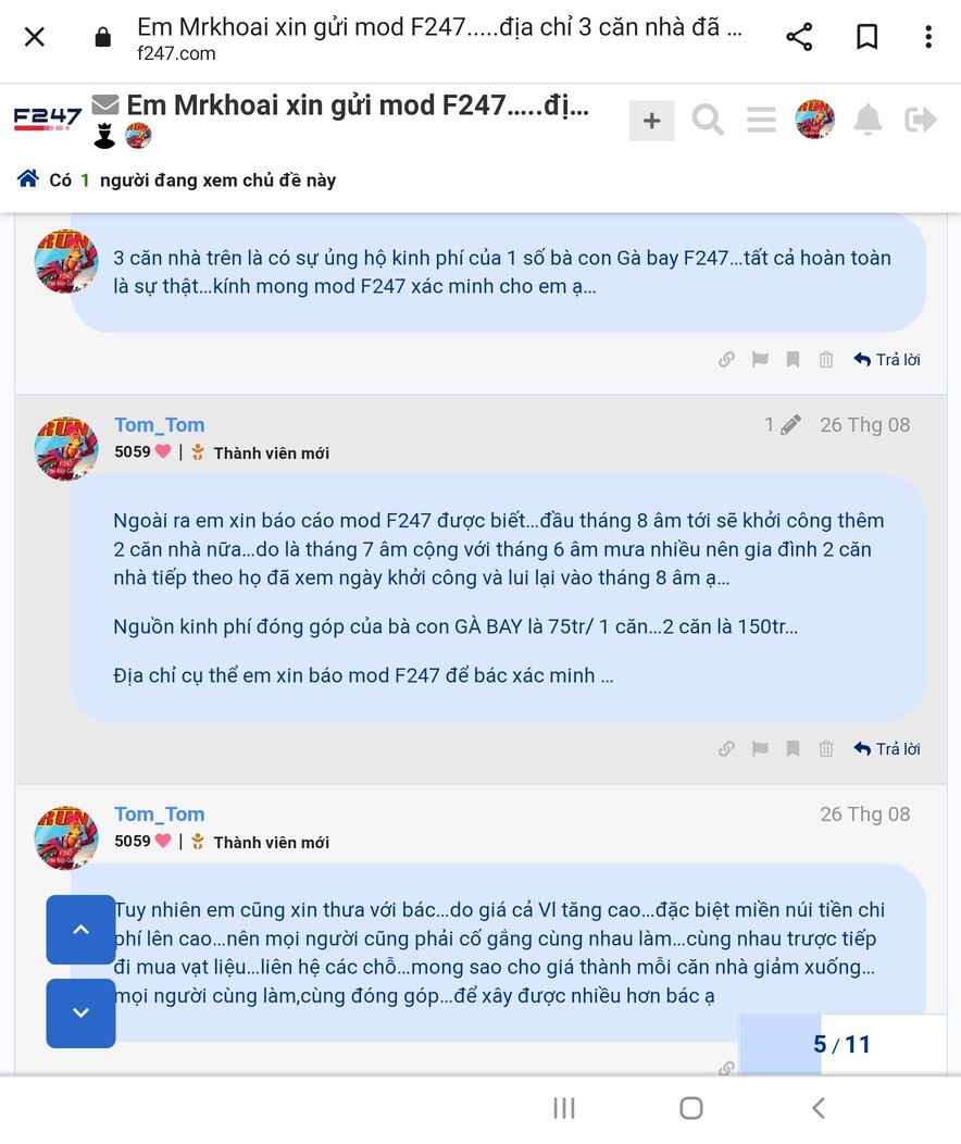 Trước tiên em xin thưa với mod và bà con…100% em không lên F247 mở píc hay kêu gọi mọi người đóng góp hay ủng hộ gì cả…chỉ là 1 số bà con Gà bay nói chuyện với nhau trong píc ủng hộ cùng làm thôi ạ…( nhưng 1 số bác cứ vô lý bắt công khai lên F247 là việc hết sức vô lý ạ…làm to chuyện lên để hạ uy tín của @Mrkhoai…gây hiểu lầm mất đoàn kết.)