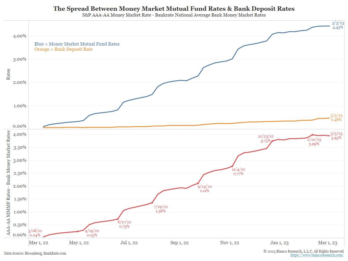 Duy trì lãi suất huy động thấp, hệ thống NH Mỹ bắt đầu bị rút tiền gửi từ Q3 2022. Quy mô rút tiền nhanh dần khi chênh lệch lãi suất huy động và Tbill, trái phiếu CP tăng ngày càng cao.