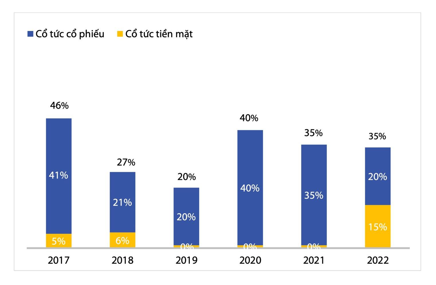 Tỷ lệ chi trả cổ tức của VIB qua các năm. Nguồn: Tài liệu ĐHĐCĐ thường niên 2017-2022.