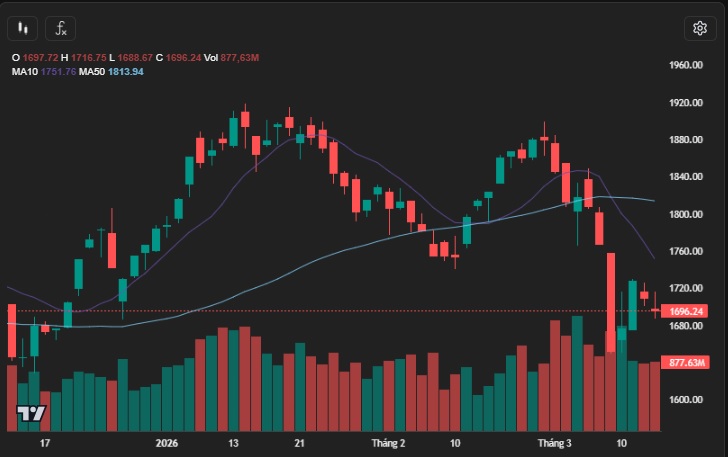 VN-Index giảm 0,8% (-13,4 điểm) vào ngày thứ Sáu, chốt tuần giao dịch tại 1.696,2 điểm. Chỉ số đã giảm tổng cộng 3,8% trong tuần qua trong bối cảnh giá dầu biến động và căng thẳng tại Trung Đông. Toàn sàn ghi nhận 153 mã tăng, 167 mã giảm và 60 mã đi ngang. Thanh khoản đi ngang so với phiên trước, đạt 27,4 nghìn tỷ đồng.