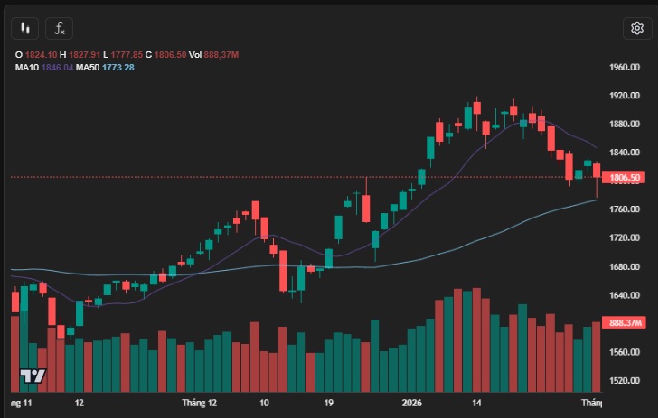 VN-Index giảm 1,2% (-22,5 điểm) trong phiên thứ Hai, đóng cửa tại 1.806,5 điểm. Sau chuỗi ngày tăng điểm liên tiếp, nhóm cổ phiếu họ Vingroup đã gây áp lực lớn lên chỉ số. Toàn sàn ghi nhận 116 mã tăng, 202 mã giảm và 41 mã đi ngang. Thanh khoản tăng so với phiên trước, đạt 31,9 nghìn tỷ đồng.