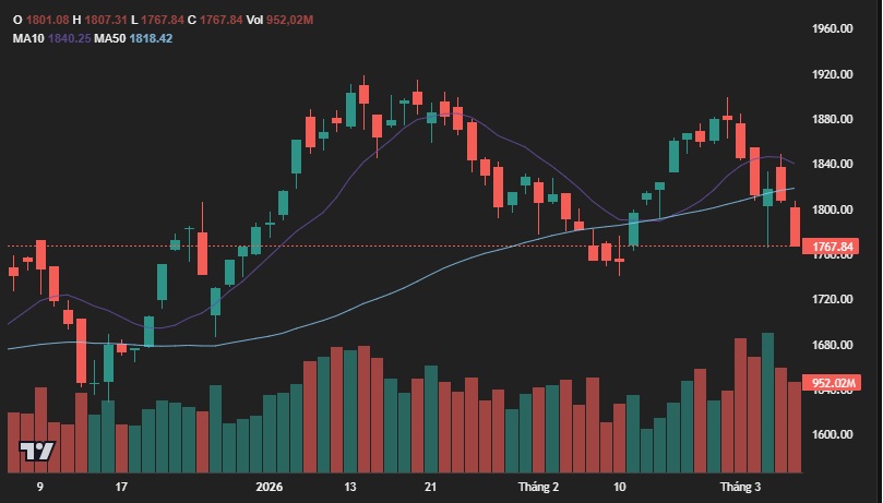 Chiến lược giao dịch 9/3/2026: Vnindex sẽ tiếp tục giảm về vùng 1.750 (MA100)