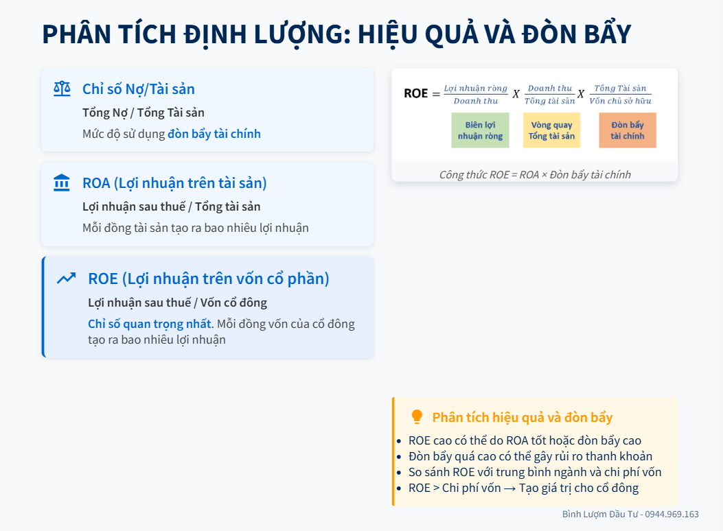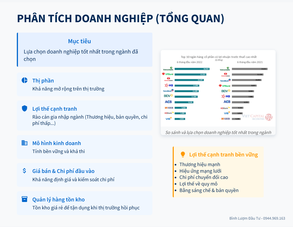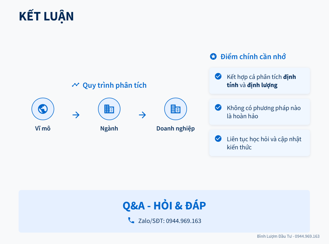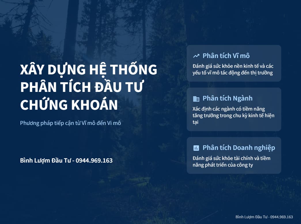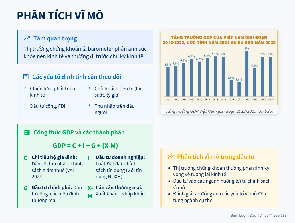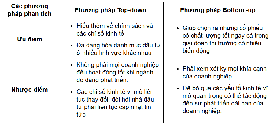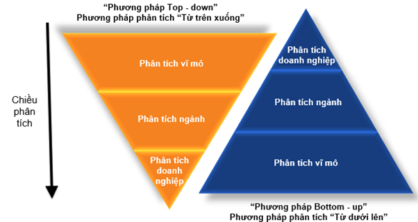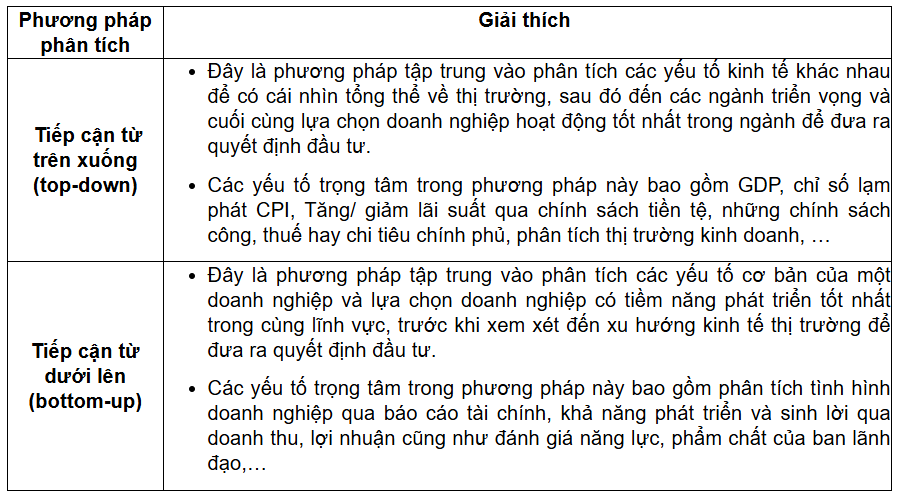 Trong đó, phân tích vĩ mô sẽ bao gồm phân tích các chỉ số kinh tế vĩ mô: GDP, lạm phát, lãi suất, chính sách tiền tệ, các quy định pháp luật, thuế, chính trị cũng như phân tích thị trường kinh doanh. Còn phân tích ngành sẽ phân tích liên quan đến các yếu tố ngành như triển vọng, cấu trúc, chu kỳ, cơ hội và thách thức cạnh tranh trong ngành. Cuối cùng là phân tích doanh nghiệp. Khi phân tích doanh nghiệp, nhà đầu tư cần quan tâm đến các yếu tố tài chính (như doanh thu, lợi nhuận, dòng tiền, …) và phi tài chính (như ban lãnh đạo, sản phẩm, mô hình quản trị, …)