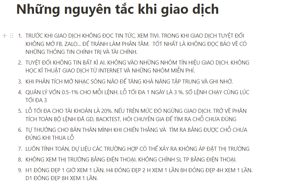 Tặng bác chủ pic và mấy anh em giao dịch Fx phái sinh nguyên tắc trade của mình nhé. Anh em áp dụng theo hoặc tự làm bộ nguyên tắc dựa trên của mình sẽ giúp anh em quản lý vốn tốt và có lợi nhuận dài hạn. Vì thị trường FX, phái sinh khắc nghiệt hơn chứng khoán nhiều nên phải quản lý siêu chặt