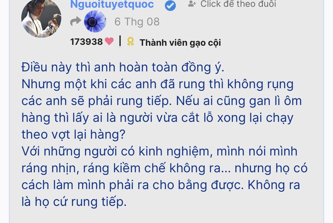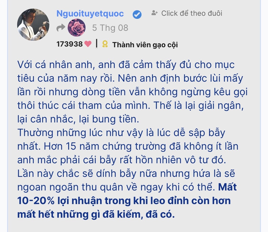 Đúng em, cơ hội là điều ai cũng có thể nói nhưng hiếm ng dám đứng lên cảnh báo về rủi ro. Đi ngược chiều đám đông và cả nhg thế lực ẩn nấp luôn là điều khó khăn. Sự thật mất lòng mà ![]()