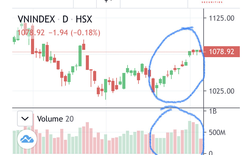 VNi đang đà đẹp, chart giá nén chặt đi lên, vùng giá 1078-1080 đang loanh quanh mấy phiên rồi mà giá cp thì tăng mạnh 15-20%, phiên xanh nhiều hơn phiên đỏ, Vậy còn lo gì nữa.