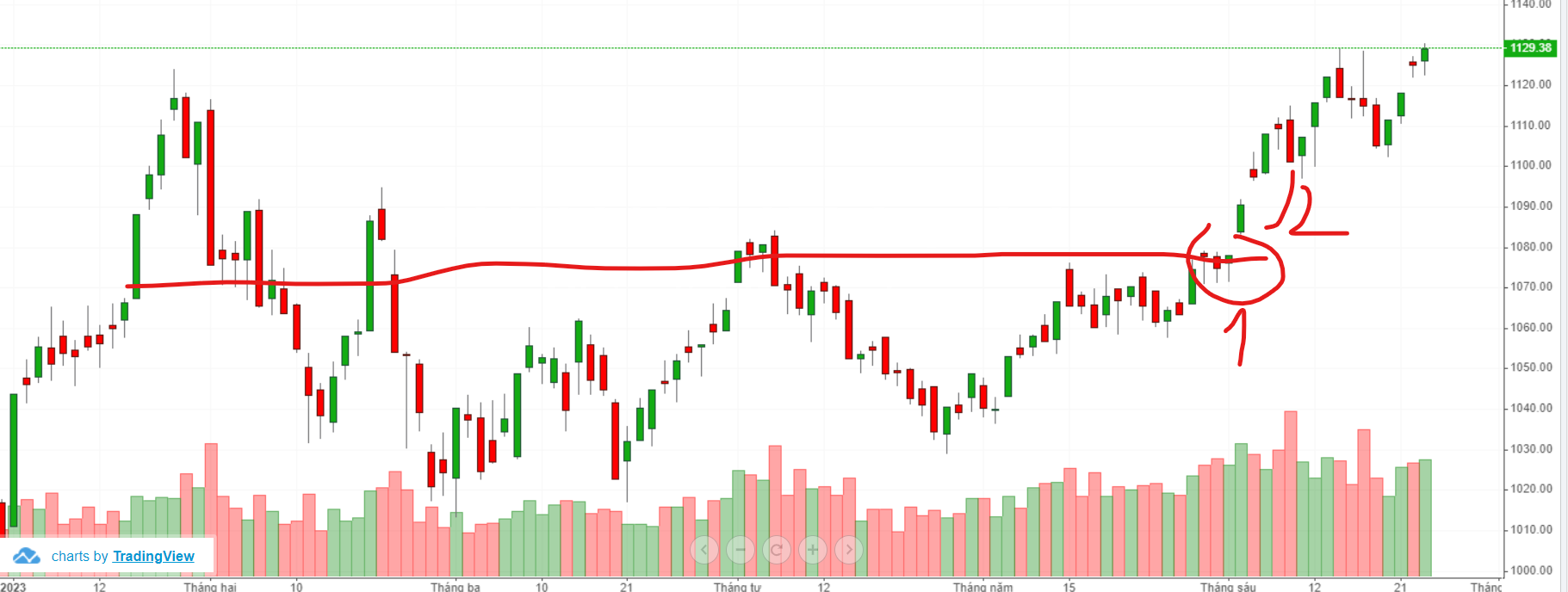 chính vì thế, khi nảy gap và tăng nên xanh, và nảy thêm gap, lực cung yếu vì đã bán tại 3 cây nến dưới (chứng minh bởi nảy gap cộng với nến tăng dài nhưng volume vẫn thấp), nên nó vẫn giữ được, nhưng lên thêm thì số mua tại 3 nến dưới bán làm cho nó vòng lại 1 chút.