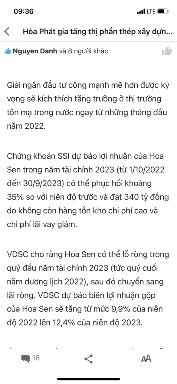 Ngành thép đã trải qua giai đoạn khó cùng cực nhất rồi. Các dự báo vĩ mô cho thấy giá thép toàn cầu sẽ tăng trở lại. Trong khi đó, các Dn thép cơ bản xử lý xong tồn kho vốn cao trong 2 quý vừa rồi khiến lỗ. Các quý tới tồn kho vốn thấp, biên lợi nhuận cao lên, doanh số cũng tăng trở lại. Thủ tướng cũng đang chỉ đạo chống đầu cơ VLXD, vì các đại lý đã kỳ vọng giá tăng nên có dấu hiệu bắt đầu gom hàng găm hàng.