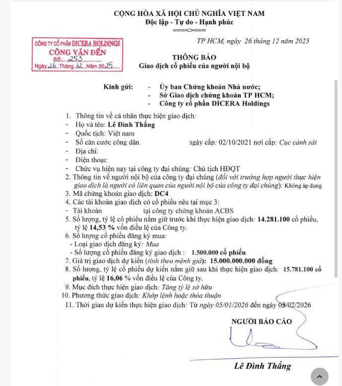 Cụ thể, ông Thắng vừa đăng ký mua vào 1,5 triệu cổ phiếu DC4 nhằm mục đích tăng tỷ lệ sở hữu. Giao dịch dự kiến diễn ra từ ngày 5/1/2026 đến ngày 4/2/2026 bằng phương thức khớp lệnh hoặc thỏa thuận.