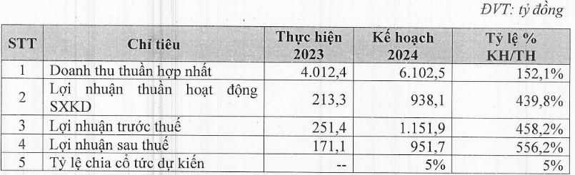 Năm 2024, BCG đặt mục tiêu doanh thu thuần hợp nhất đạt gần 6,103 tỷ đồng và lãi sau thuế gần 952 tỷ đồng, tăng 52% về doanh thu và gấp gần 5.6 lần về lợi nhuận. Công ty dự kiến không chia cổ tức 2023, còn cổ tức 2024 có tỷ lệ 5%.