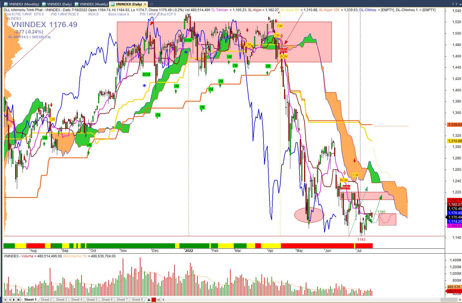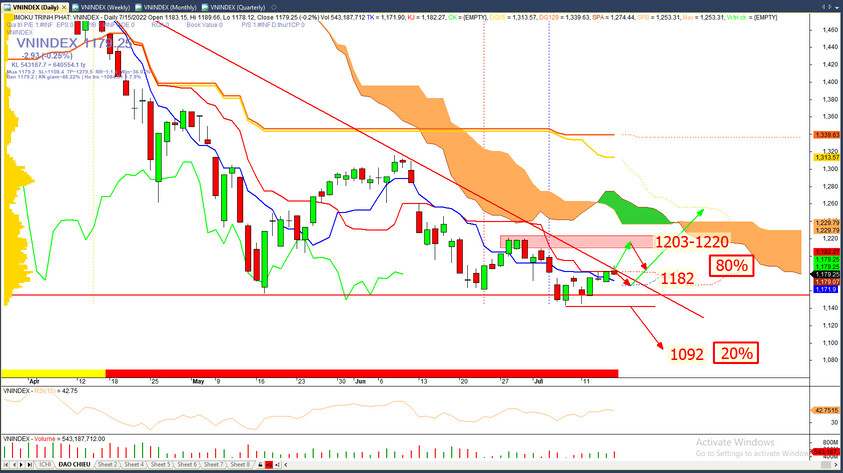 Ngắn hạn phiên cuối tuần là phiên hồi phục thứ 2 sau nhịp chỉnh ngắn hạn của cổ phiếu nhóm ngành trụ, sự tác động của nhóm ngành BĐS là dấu hiệu tích cực cho VNINDEX hồi phục tích lũy lại. Các nhóm ngành trụ như Bank, Chứng, Thép tiếp tục trên nhịp phục hồi trung hạn là tín hiệu tốt cho thị trường khó có thể chỉnh sâu trong trung hạn. Kịch bản khả năng lình xình tích lũy quanh vùng 1180 trong ngắn hạn. Vượt và đóng cửa trên 1180 VNINDEX có cơ hội nhịp sóng hồi về vùng 1230 trong ngắn hạn lình xình tích lũy trở lại.