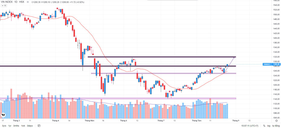 Kết thúc phiên giao dịch ngày 25/08, VNI ở mốc 1288.88 tăng +11.72 điểm :